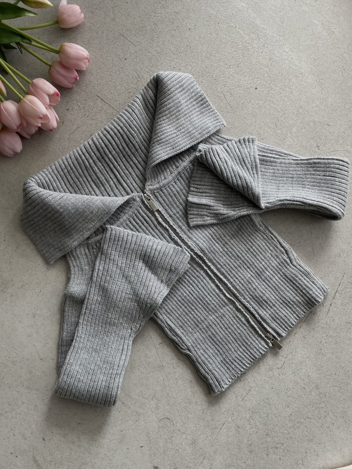 Gri fermuarlı kayık yaka triko hırka