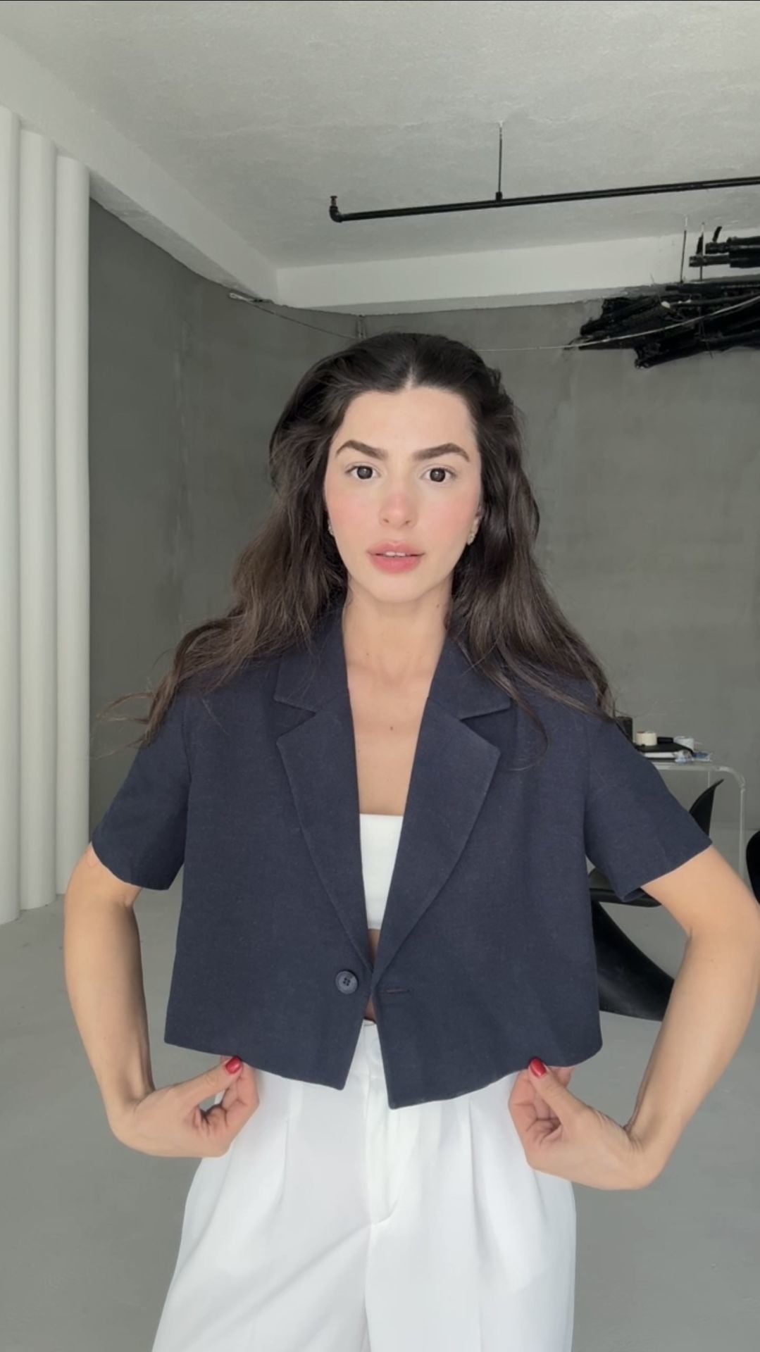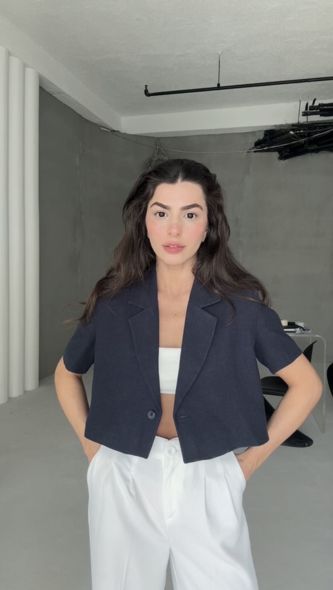 Lacivert keten crop ceket