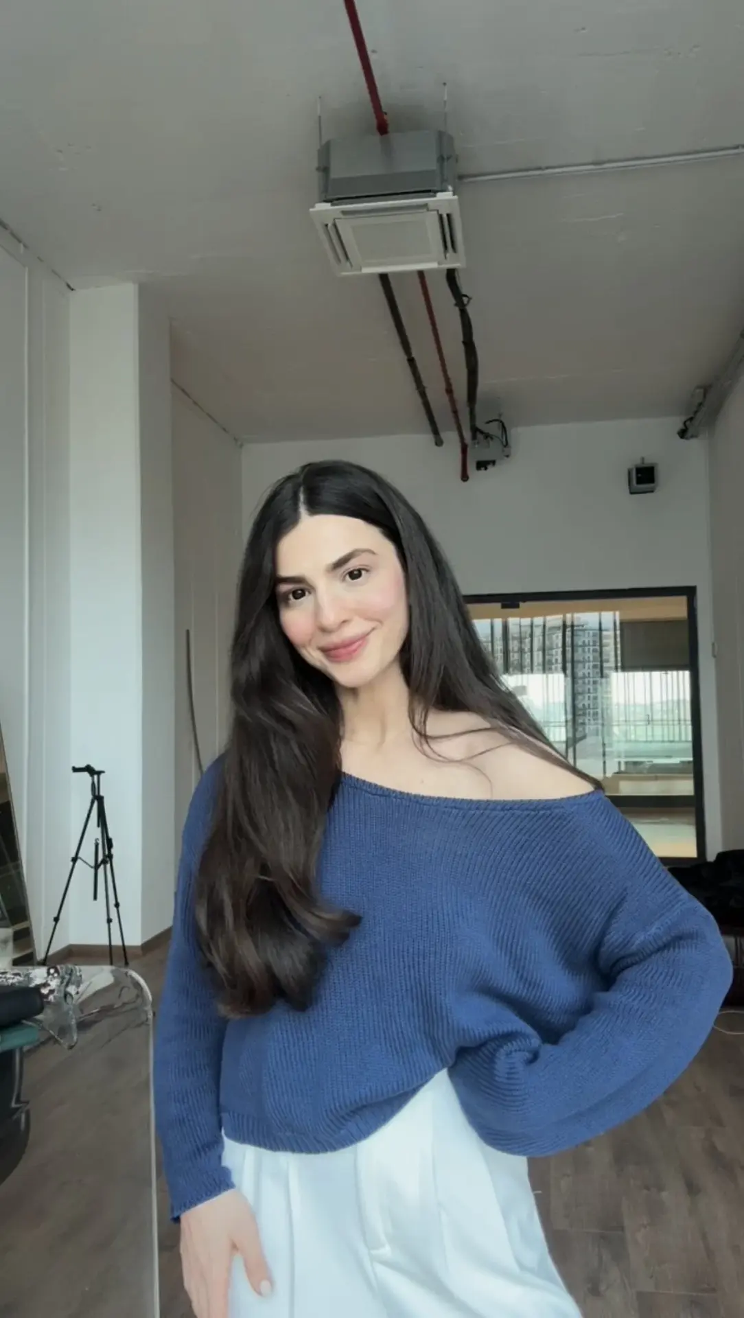 Omuz dekolteli mavi ince triko kazak